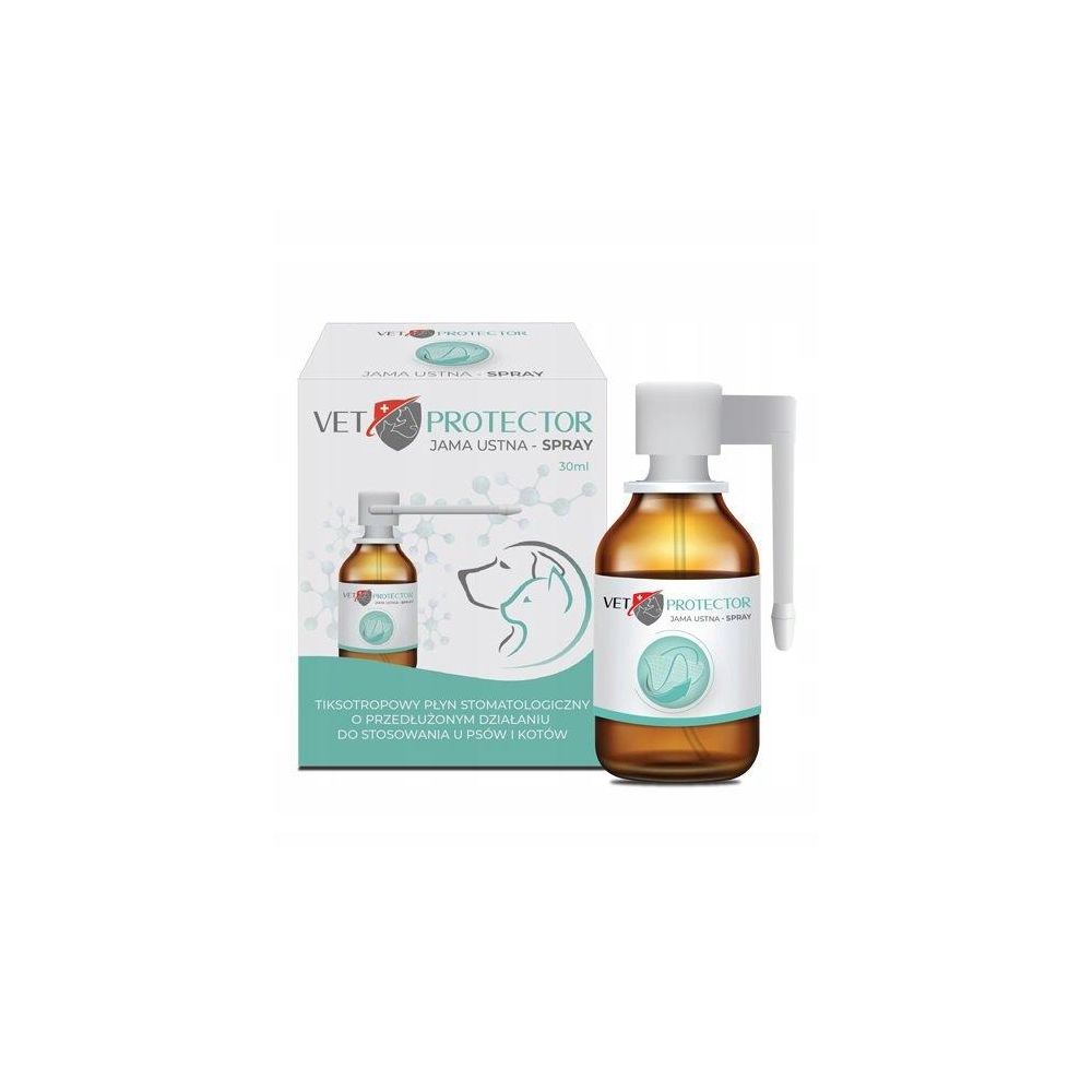 VET PROTECTOR® JAMA USTNA – SPRAY wykazuje silne działanie przeciwbakteryjne i oczyszczające oraz hamuje rozwój stanu zapalnego, skutecznie przylega do powierzchni zębów i dziąseł.