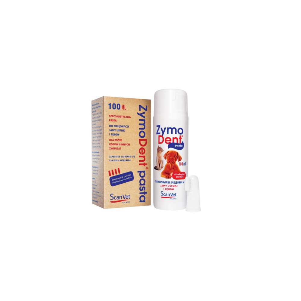 Zastosowanie: ZymoDent stosuje się do codziennej pielęgnacji uzębienia i jamy ustnej. Kompozycja specjalistycznych składników zapewnia wielokierunkowe działanie: - Oczyszczanie powierzchni zębów - Enzymatyczne rozpuszczanie osadu nazębnego - Zapobieganie powstawaniu płytki i kamienia nazębnego - Neutralizacja lotnych związków siarki (przyczyny nieświeżego oddechu) - Ograniczanie populacji szkodliwych bakterii w jamie ustnej i zapobieganie ich proliferacji - Wspomagająco w schorzeniach w obrębie jamy ustnej, takich jak stany zapalne dziąseł Regularne stosowanie sprzyja utrzymaniu zdrowego uzębienia u zwierząt. Właściwości: Obecność bakterii w jamie ustnej powoduje powstawanie płytki nazębnej, kamienia nazębnego, nieprzyjemnego zapachu z jamy ustnej oraz stanów zapalnych dziąseł. Składniki pasty ZymoDent skutecznie ograniczają populację bakterii w jamie ustnej, rozpuszczają płytkę nazębną, ograniczając w ten sposób ryzyko rozwoju poważniejszych problemów w obrębie jamy ustnej. Podstawą działania pasty jest specjalistyczny enzymatyczny kompleks, wykazujący wielokierunkowe działanie. Zawartość naturalnie występujących enzymów - laktoperoksydazy, laktoferyny, lizozymu i oksydazy glukozowej umożliwia rozpuszczenie osadu i likwidację drobnoustrojów, znacznie ograniczając ich obecność w jamie ustnej. Kompleks enzymatyczny zawarty w paście ZymoDent przypomina kombinację enzymów obronnych obecnych w ślinie. Pośrednie związki procesów peroksydacji i innych zachodzących reakcji enzymatycznych w obecności soli izotiocyjanianowej wykazują silny efekt bakteriobójczy. Jednocześnie składniki te chronią szkliwo zapobiegając odkładaniu się płytki nazębnej, hamują enzymy wytwarzane przez Streptococcus mutans (jedna z bakterii tworzących biofilm na powierzchni zębów), likwidują nieprzyjemny zapach i poprawiają ogólny stan higieniczny jamy ustnej. Kolejnym ważnym składnikiem pasty jest delikatny środek abrazyjny na bazie krzemionki, który zapewnia łagodne, mechaniczne oczyszczanie zębów, nawet w przypadku braku szczotkowania. Istotna jest też zawartość jonów cynku, który wiąże lotne związki siarki odpowiedzialne za nieprzyjemny zapach. Dodatkowo działa on synergistycznie z enzymatycznym systemem peroksydazy jako katalizator wielu reakcji enzymatycznych. Wspomaga także gojenie i regenerację dziąseł. Działanie składników pasty wzajemnie się uzupełnia, zapewniając skuteczną higienę jamy ustnej i zębów u zwierząt.