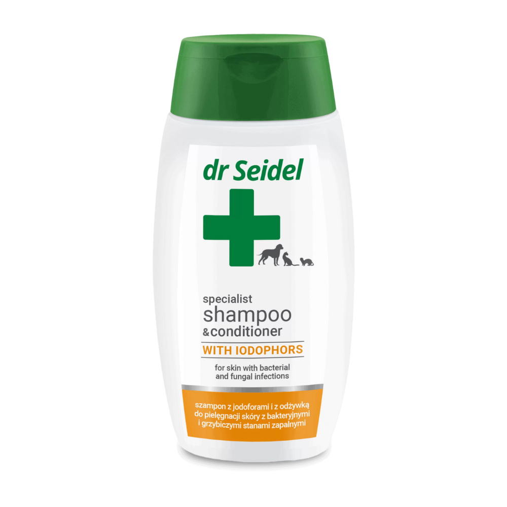 Skoncentrowany szampon jodoforowy dr Seidla jest doskonałym preparatem pielęgnacyjnym do stosowania w czasie terapii stanów zapalnych skóry i świądu wywołanych zakażeniami grzybiczymi i bakteryjnymi. Szampon hamuje nadmierne przetłuszczanie skóry i eliminuje przykre zapachy. Łagodzi podrażnienia wywołane ukąszeniami pcheł. Skutecznie usuwa ze skóry wszystkie zabrudzenia i przywraca włosom naturalną miękkość i połysk.