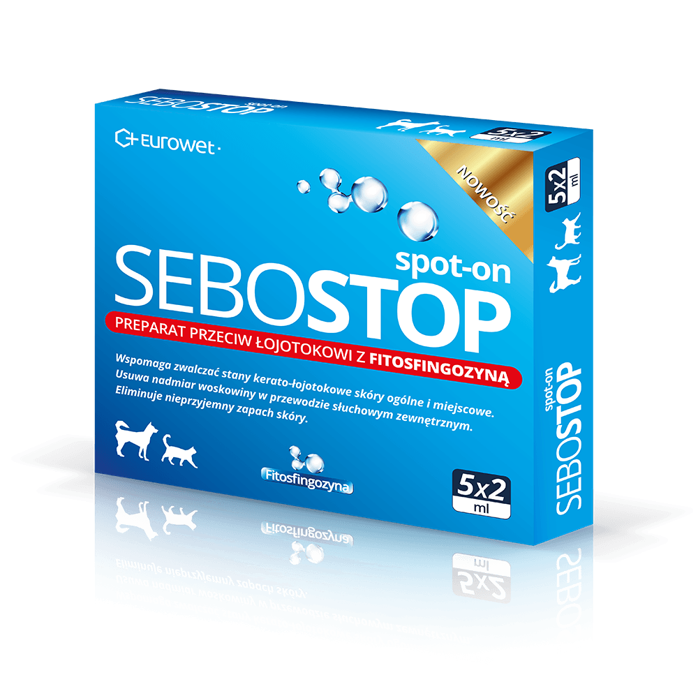 Sebostop spot-on jest dermokosmetykiem weterynaryjnym, specjalnie przystosowanym dla psów i kotów z objawami łojotoku. Fitosfingozyna pozwala na odbudowę warstwy rogowej naskórka, zmniejszenie łojotoku oraz wspomaga procesy regulujące mikroflorę naskórka. Pozostałe składniki preparatu chronią skórę przed odwodnieniem i łagodzą jej podrażnienia.