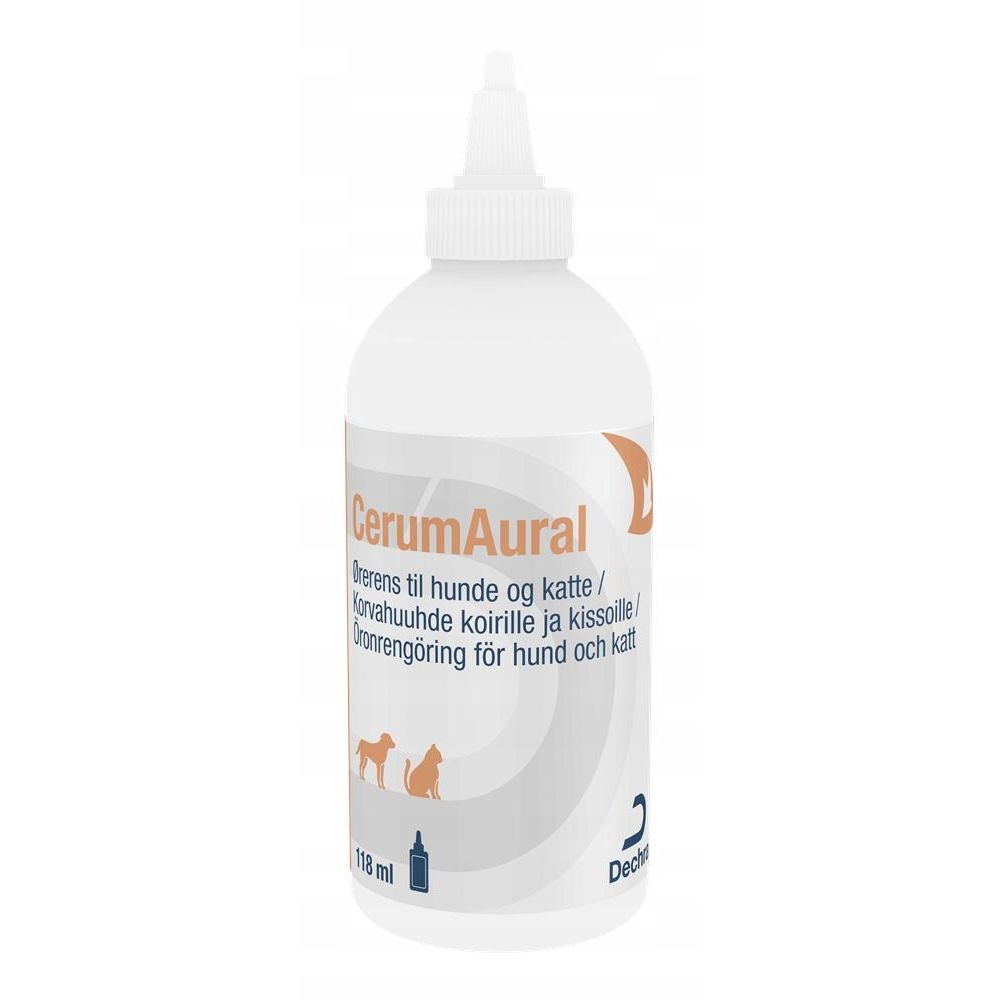 CerumAural - ceruminolityczny preparat do czyszczenia przewodów słuchowych psów i kotów. CerumAural nie zawiera antybiotyków. Preparat stworzony szczególnie z myślą o psach ze zwisającymi uszami u których obserwuje się nadmierne wytwarzanie woskowiny.Skład:22% skwalen, mirystynian izopropylu, olej parafinowy.Sposób użycia:Przed użyciem dobrze wstrząsnąć. Aplikować do przewodu słuchowego preparat o temperaturze ciała. Następnie delikatnie masować podstawę małżowiny usznej. Wacikiem usunąć nadmiar roztworu. Nie stosować na silnie podrażnioną skórę. Zabiegi powtarzać w razie konieczności lub zgodnie z zaleceniami lekarza weterynarii.Środki ostrożności:CerumAural przeznaczony jest wyłącznie do stosowania miejscowego. Należy unikać kontaktu z oczami. W przypadku dostania się preparatu do oka należy je starannie przemyć wodą. Może powodować podrażnienie skóry. W przypadku podrażnienia skóry należy przerwać stosowanie preparatu i skonsultować się z lekarzem weterynarii. Nie stosować na silnie podrażnioną skórę. Przechowywać poza zasięgiem dzieci i zwierząt. Po użyciu umyć ręce. Przechowywać w temperaturze 15-30 st. C