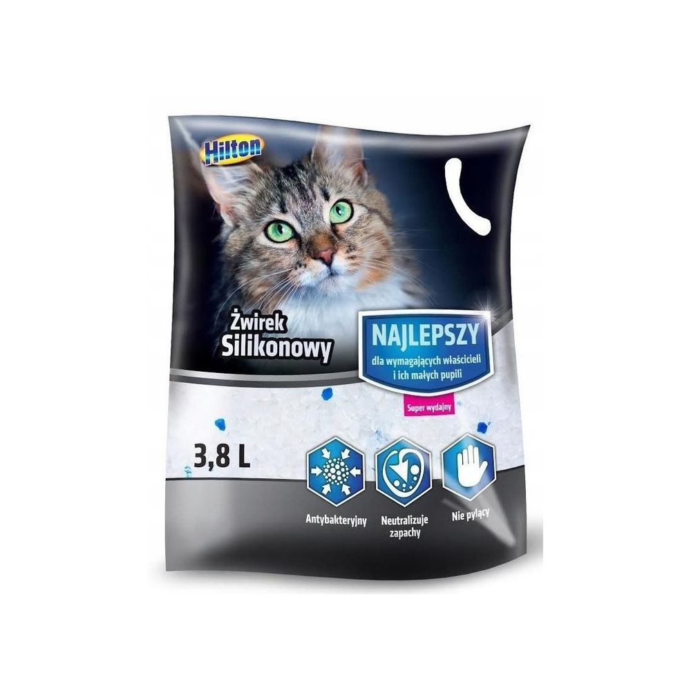 Żwirek silikonowy Hilton to produkt o innowacyjnej formule, posiadający właściwości oczyszczające i dezynfekujące.