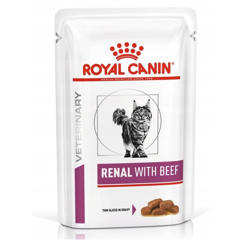 Royal Canin Renal z wołowiną to zbilansowana karma mokra dla kotów cierpiących na chroniczne schorzenia nerek, jest również odpowiednia jako profilaktyka kamicy moczowej, wysoka akceptacja, odciąża nerki.