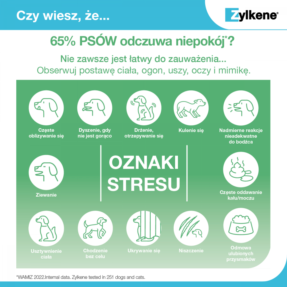 STOSOWANIE:kapsułki Zylkene® zawierają składnik naturalnego pochodzenia o potwierdzonym działaniu polegającym na łagodzeniu niepokoju / przywracaniu stanu odprężenia otrzymywany z występującego w mleku białka o nazwie kazeina. Podawanie produktu psom i kotom należy rozpocząć przed spodziewanym zdarzeniem takim jak zmiana otoczenia, pozostawienie samemu, przeprowadzka do nowego domu, pojawienie się nowych osób lub zwierząt, odsadzanie, podróż, fajerwerki lub zaburzenia typowego rytmu dnia pupila.