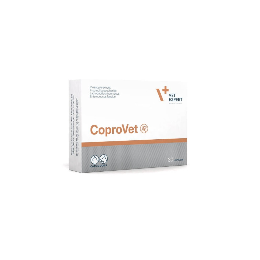 CoproVet to preparat zapobiegający najczęstszym przyczynom zjadania odchodów przez zwierzęta, czyli zjawisku koprofagii. CoproVet wspomaga prawidłowe procesy trawienia, uzupełnia i stymuluje naturalną mikroflorę przewodu pokarmowego oraz wspomaga redukcję nieprzyjemnego zapachu.