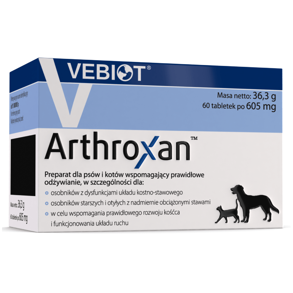 Arthroxan to preparat dla psów i kotów wspomagający prawidłowe odżywianie, zwłaszcza dla osobników, u których występują dysfunkcje w obrębie układu kostno-stawowego, starszych i otyłych osobników, które narażone są na nadmierne obciążenie w obrębie stawów oraz dla ras predysponowanych do wystąpienia nieprawidłowości układu kostno-stawowego.