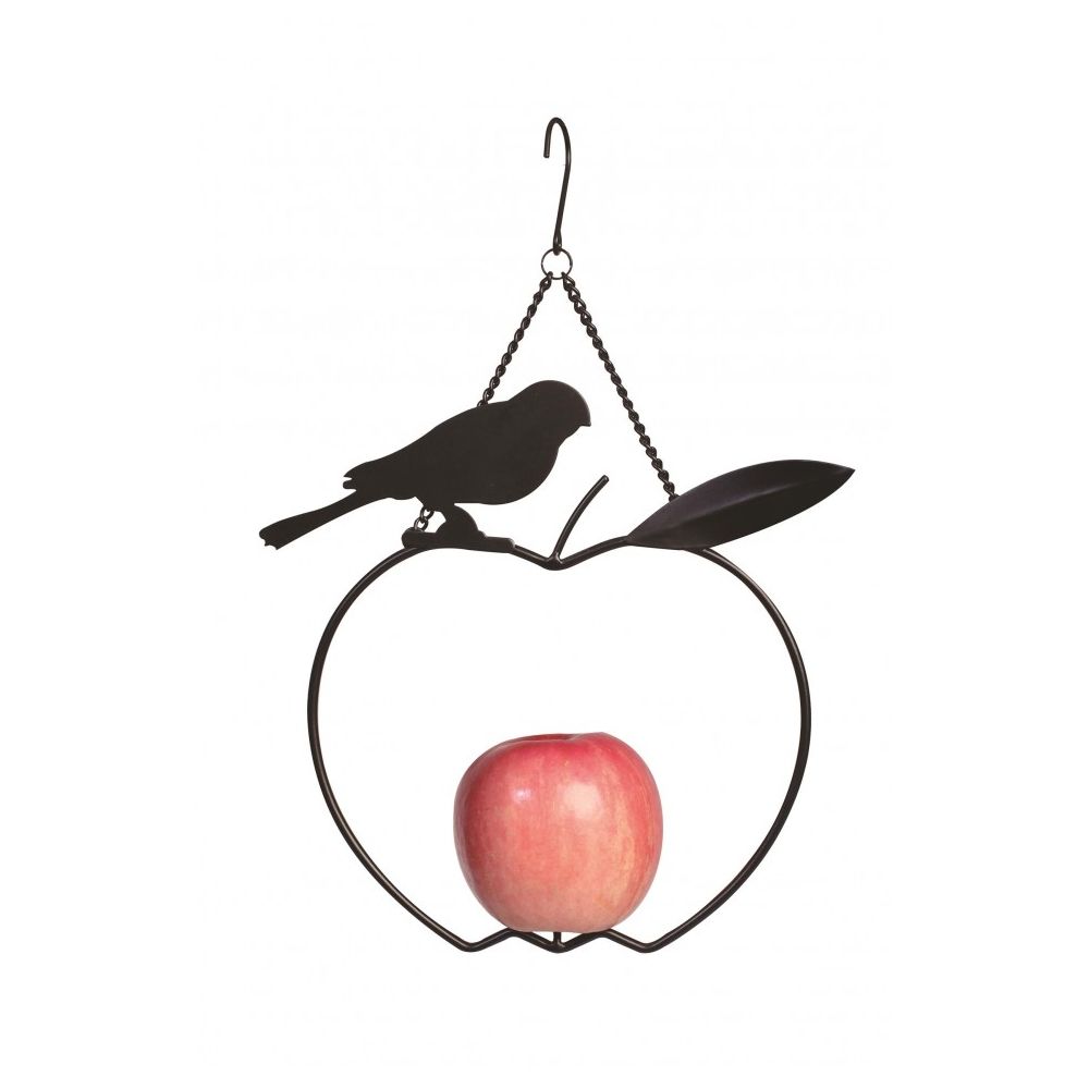Metalowy karmnik na kule tłuszczowe lub owoce, dla ptaków do powieszenia. W kształcie jabłka, z wizerunkiem metalowego ptaka. Kule tłuszczowe stanowią ważny element diety wolnożyjących ptaków, ponieważ dostarczają im dużą dawkę energii, potrzebną do utrzymania odpowiedniej temperatury ciała.