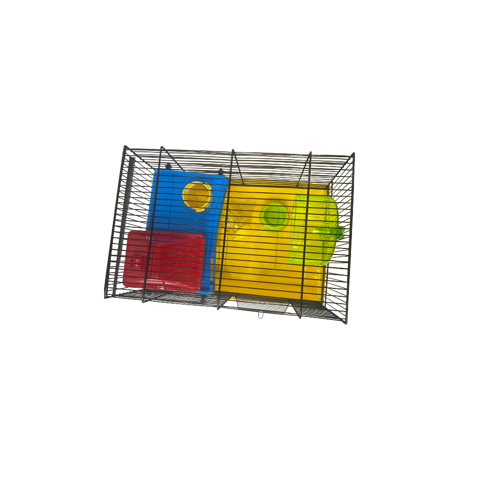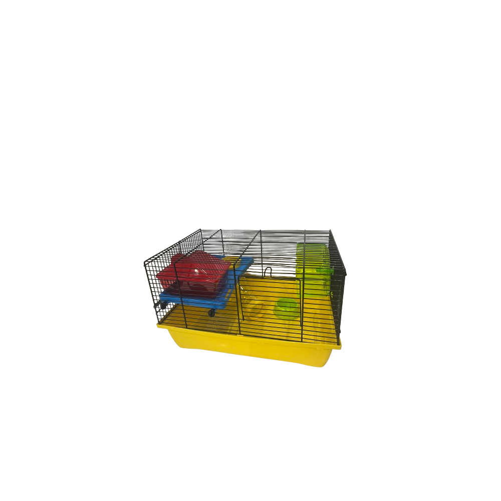 Klatka dla chomika z wyposażeniem zawierającym miseczkę, kołowrotek, podest z tunelem oraz domek. Wymiary: 43 x 28 x 23,5 cm