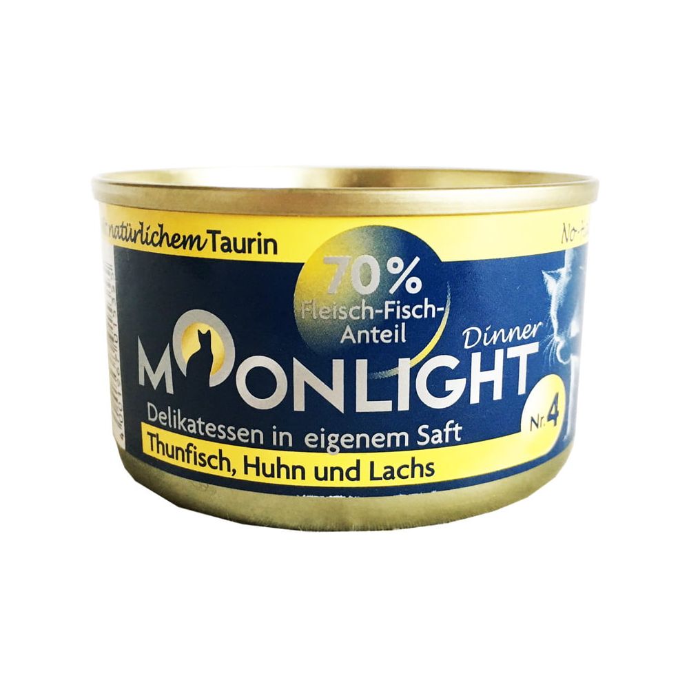 Moonlight Dinner to doskonały karmy dla kotów, w 100% naturalne. Nie zawierają żadnych zbóż, glutenu, sztucznych barwników, aromatów i konserwantów. Wyprodukowane z zastosowaniem najwyższych standardów jakości produkcji, aby zachować w pokarmie wszystkie jego najcenniejsze składniki odżywcze. Zdrowe, idealnie dostosowane do potrzeb żywieniowych i naturalnej diety kotów. Białko w karmach Moonlight Dinner jest wyłącznie pochodzenia zwierzęcego. Naturalne składniki, wysoka zawartość najwyższej jakości mięsa i ryb, różnorodność składników i smaków zadowolą każdego kota, nawet niejadka.