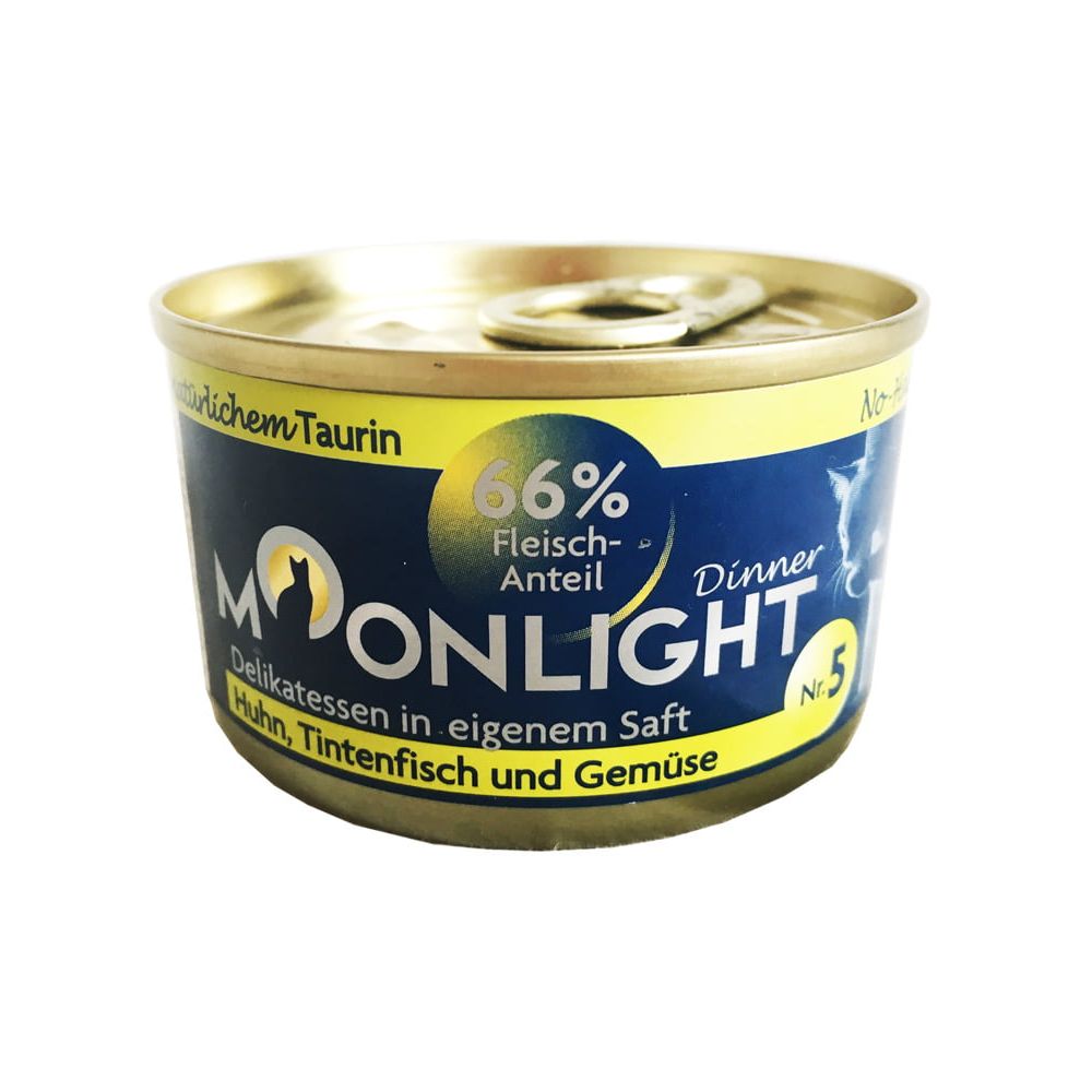 Moonlight Dinner to doskonały karmy dla kotów, w 100% naturalne. Nie zawierają żadnych zbóż, glutenu, sztucznych barwników, aromatów i konserwantów. Wyprodukowane z zastosowaniem najwyższych standardów jakości produkcji, aby zachować w pokarmie wszystkie jego najcenniejsze składniki odżywcze. Zdrowe, idealnie dostosowane do potrzeb żywieniowych i naturalnej diety kotów. Białko w karmach Moonlight Dinner jest wyłącznie pochodzenia zwierzęcego. Naturalne składniki, wysoka zawartość najwyższej jakości mięsa i ryb, różnorodność składników i smaków zadowolą każdego kota, nawet niejadka.