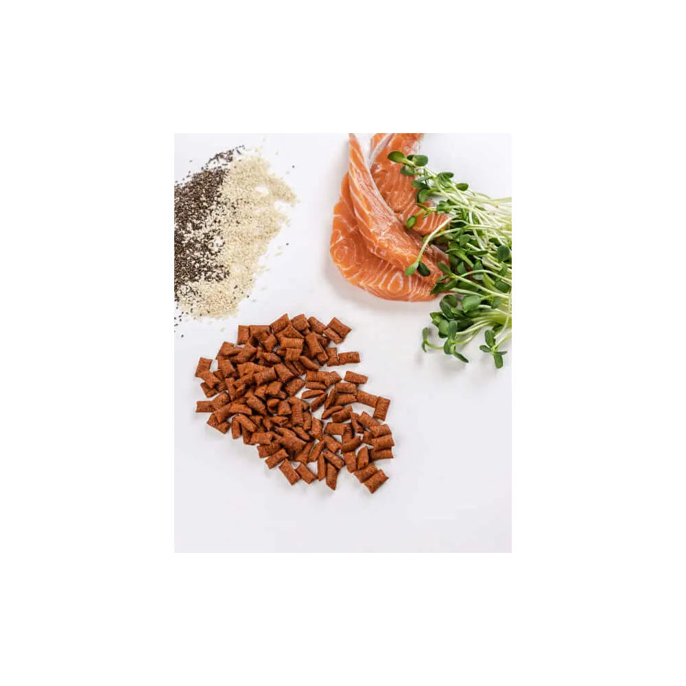Skład: zboża, mięso i produkty pochodzenia zwierzęcego, oleje i tłuszcze, ekstrakt z białka roślinnego, ryby i ich produkty uboczne (4% łosoś, naturalne źródło kwasów tłuszczowych omega-3), minerały. Składniki analityczne: Surowe białko - 29%, zawartość tłuszczu - 20%, surowe włókno - 1%, składniki nieorganiczne- 6% Dodatki na 1 kg: witamina A - 6000 IU, witamina D3 - 400 IU, witamina E - 100 mg, tauryna - 1000 mg. Wartość energetyczna: 4260 kcal/kg.