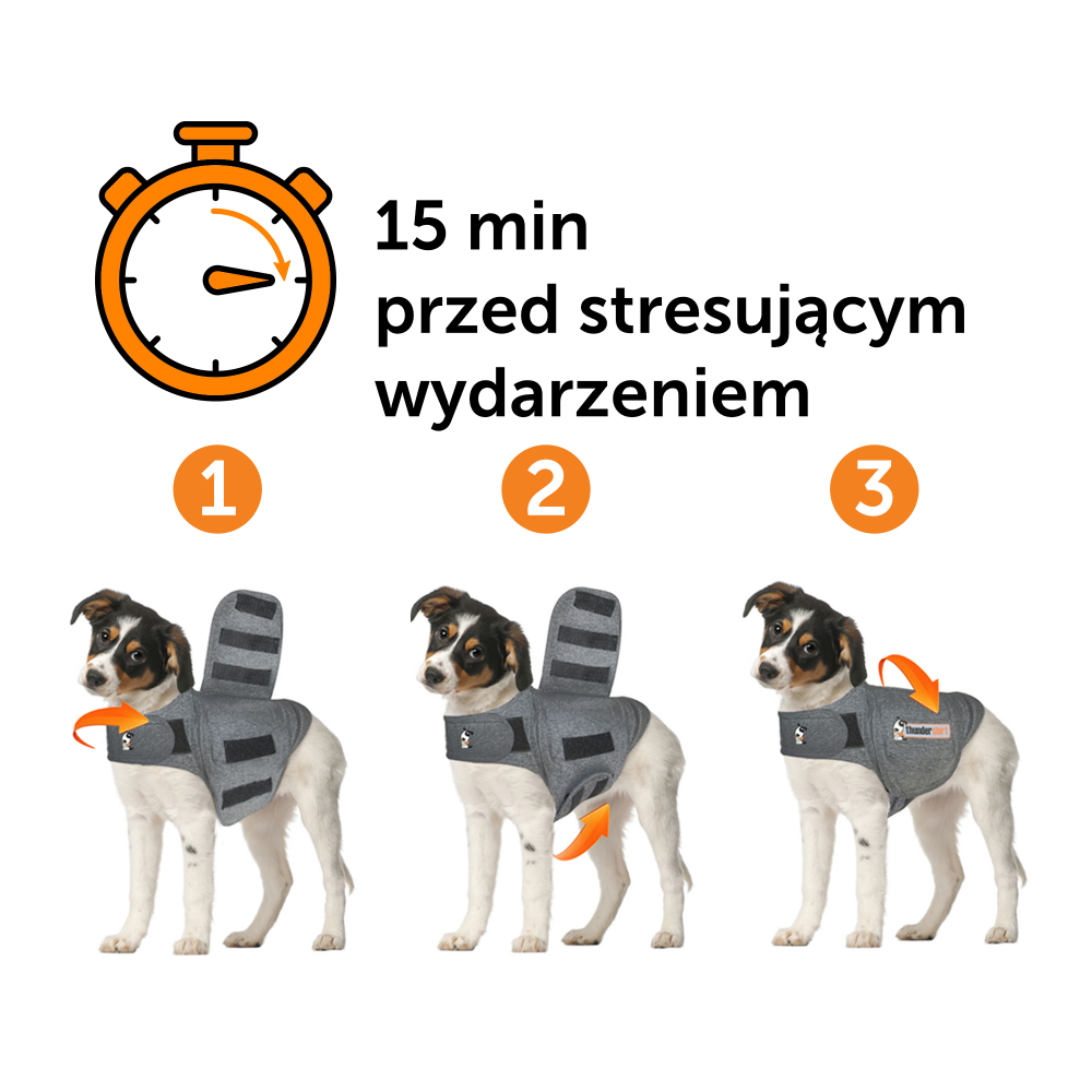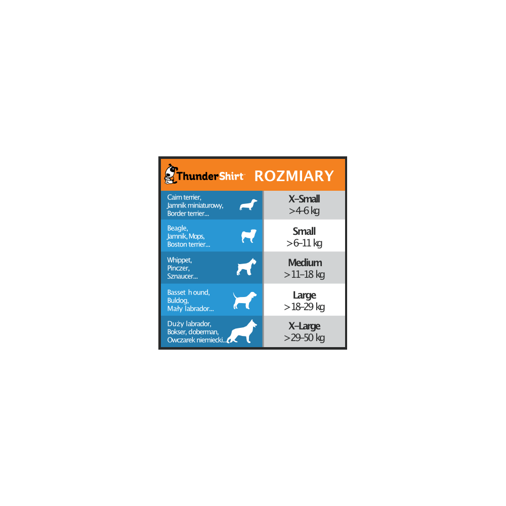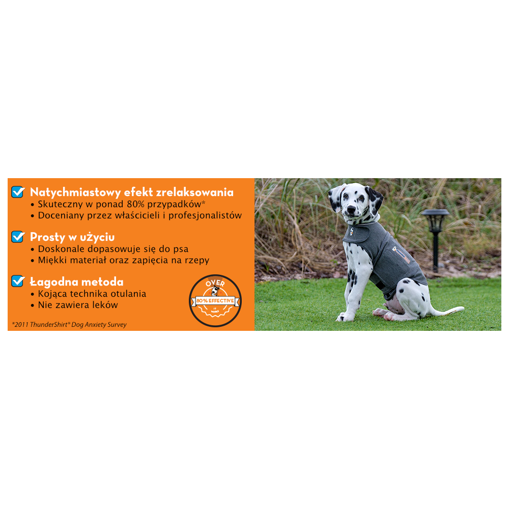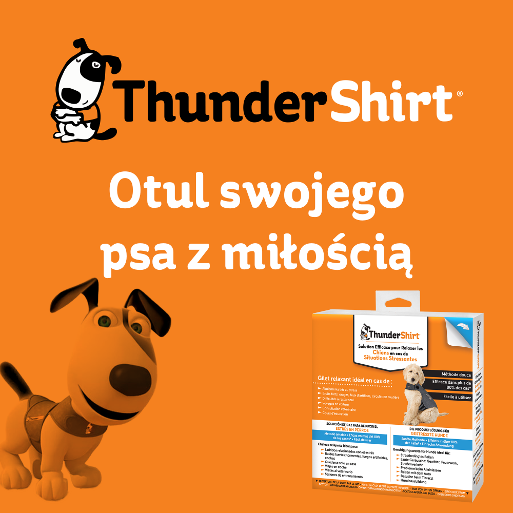 ThunderShirt to oryginalne, zalecane przez weterynarzy, naturalne rozwiązanie uspokajające, które pomaga zmniejszyć niepokój u psów. Opatentowana konstrukcja kamizelki uspokajającej, podobnie jak owijanie niemowlęcia, wywiera delikatny, stały nacisk, aby zrelaksować psy z problemami związanymi ze stresem (ze strachu, niepokoju lub nadmiernego podniecenia). ThunderShirt pomaga zmniejszyć problemy związane ze stresem, takie jak szczekanie, głośne dźwięki, separacja, podróże, wizyty u weterynarza i szkolenia. Zarządzaj strachem i niepokojem swojego psa w dobrym stylu! Pokochasz uspokajający wpływ ThunderShirt na swojego psa.