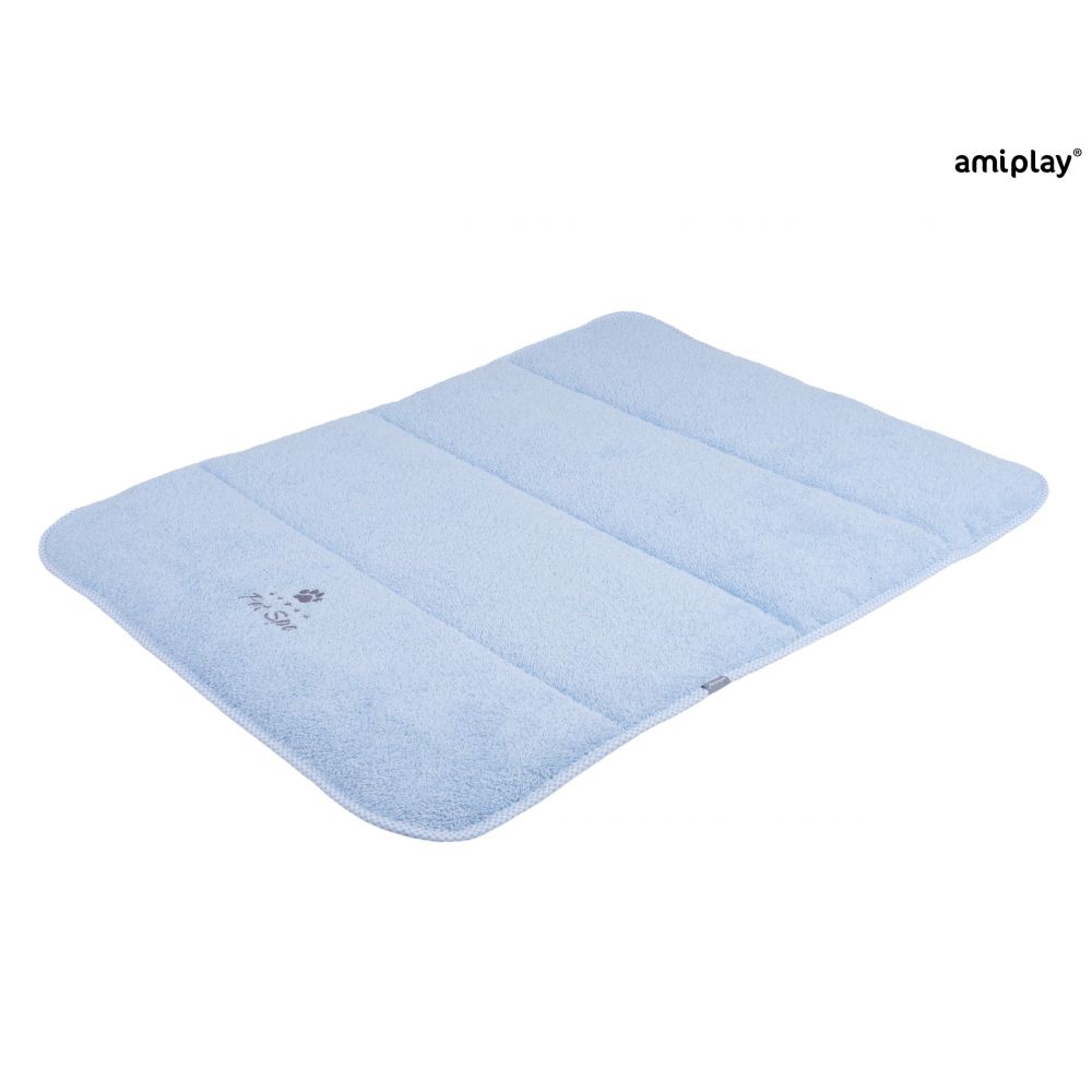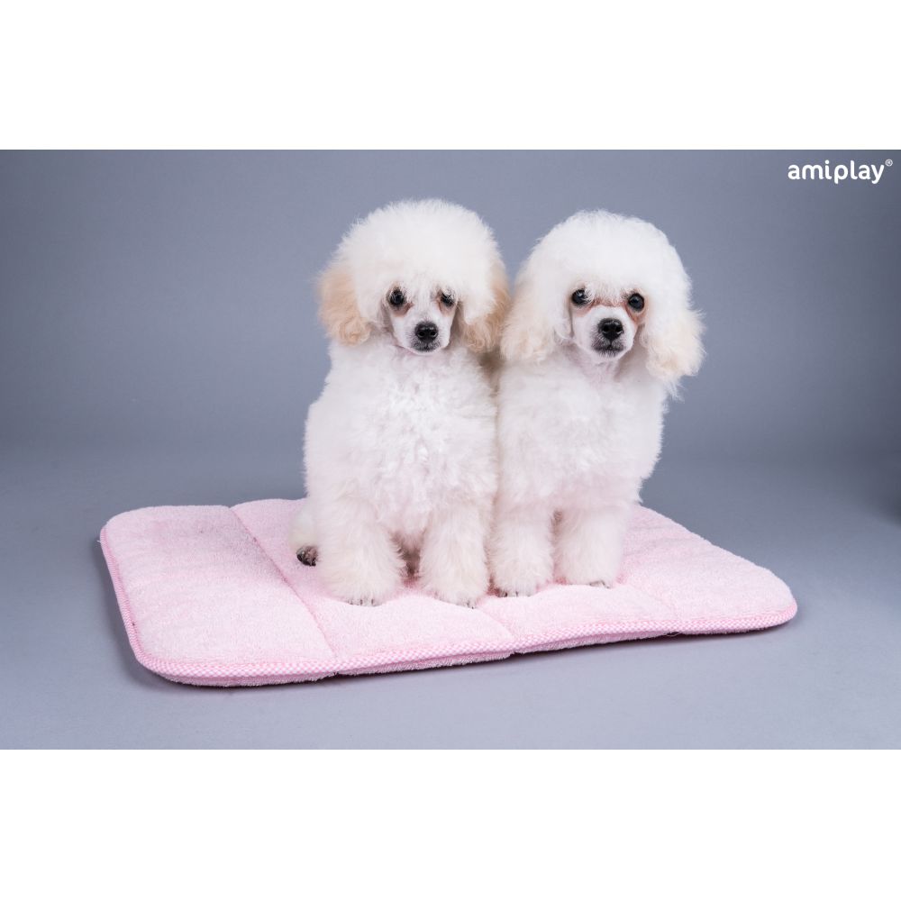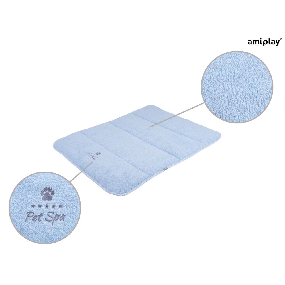 Mata kąpielowa z serii Spa to idealne rozwiązanie podczas kąpieli. Doskonale sprawdzi się zarówno podczas zabiegów pielęgnacyjnych, które nie wymagają moczenia całego psa jak i tych wykonywanych w wannie bądź pod prysznicem. Jest bardzo chłonna i nie ślizga się, dzięki czemu może być stosowana podczas kąpieli, aby ograniczyć stres psa związany z niestabilnym podłożem i rozjeżdżaniem się łapek. Pozwala też zabezpieczyć powierzchnię przed nadmiernym zamoczeniem. Wykonana z wysokiej jakości tkaniny bawełnianej typu frotte. Mata pozwoli zapewnić komfortową opiekę nad psem podczas każdej kąpieli. Niezwykle miękka tkanina frotte zapewni mu najprzyjemniejsze odczucia, także dzięki zastosowaniu produktów w dedykowanych rozmiarach. Kolekcja amiplay Spa to gama różnorodnych, funkcjonalnych produktów, które pozwolą stworzyć komplety akcesoriów kąpielowych, dostosowane do indywidualnych potrzeb. Warto pozwolić sobie na odrobinę luksusu tworząc domowy salon piękności dla swojego czworonożnego przyjaciela. Produkty tej serii są bardzo chłonne i przyjemne w dotyku dla zapewnienia komfortu. Stonowana, pastelowa kolorystyka, będzie się doskonale prezentować w każdej łazience. Bawełniana tkanina nie powoduje podrażnień, ani uczuleń. Jednocześnie jej odświeżenie jest bardzo łatwe, ponieważ może być ona prana w pralce w wyższych temperaturach, aby znów była gotowa do bezpiecznego użycia. Warto pamiętać, aby zadbać o naturalne pH i bariery ochronne skóry psa. Dla równowagi tych struktur dobrze jest ograniczyć liczbę kąpieli, zwłaszcza jeśli mamy możliwość zastosowania innych środków, takich jak suchy szampon bądź ręcznik.