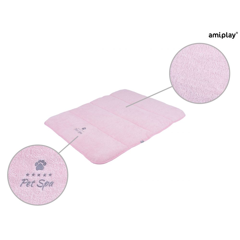 Mata kąpielowa z serii Spa to idealne rozwiązanie podczas kąpieli. Doskonale sprawdzi się zarówno podczas zabiegów pielęgnacyjnych, które nie wymagają moczenia całego psa jak i tych wykonywanych w wannie bądź pod prysznicem. Jest bardzo chłonna i nie ślizga się, dzięki czemu może być stosowana podczas kąpieli, aby ograniczyć stres psa związany z niestabilnym podłożem i rozjeżdżaniem się łapek. Pozwala też zabezpieczyć powierzchnię przed nadmiernym zamoczeniem. Wykonana z wysokiej jakości tkaniny bawełnianej typu frotte. Mata pozwoli zapewnić komfortową opiekę nad psem podczas każdej kąpieli. Niezwykle miękka tkanina frotte zapewni mu najprzyjemniejsze odczucia, także dzięki zastosowaniu produktów w dedykowanych rozmiarach. Kolekcja amiplay Spa to gama różnorodnych, funkcjonalnych produktów, które pozwolą stworzyć komplety akcesoriów kąpielowych, dostosowane do indywidualnych potrzeb. Warto pozwolić sobie na odrobinę luksusu tworząc domowy salon piękności dla swojego czworonożnego przyjaciela. Produkty tej serii są bardzo chłonne i przyjemne w dotyku dla zapewnienia komfortu. Stonowana, pastelowa kolorystyka, będzie się doskonale prezentować w każdej łazience. Bawełniana tkanina nie powoduje podrażnień, ani uczuleń. Jednocześnie jej odświeżenie jest bardzo łatwe, ponieważ może być ona prana w pralce w wyższych temperaturach, aby znów była gotowa do bezpiecznego użycia. Warto pamiętać, aby zadbać o naturalne pH i bariery ochronne skóry psa. Dla równowagi tych struktur dobrze jest ograniczyć liczbę kąpieli, zwłaszcza jeśli mamy możliwość zastosowania innych środków, takich jak suchy szampon bądź ręcznik.