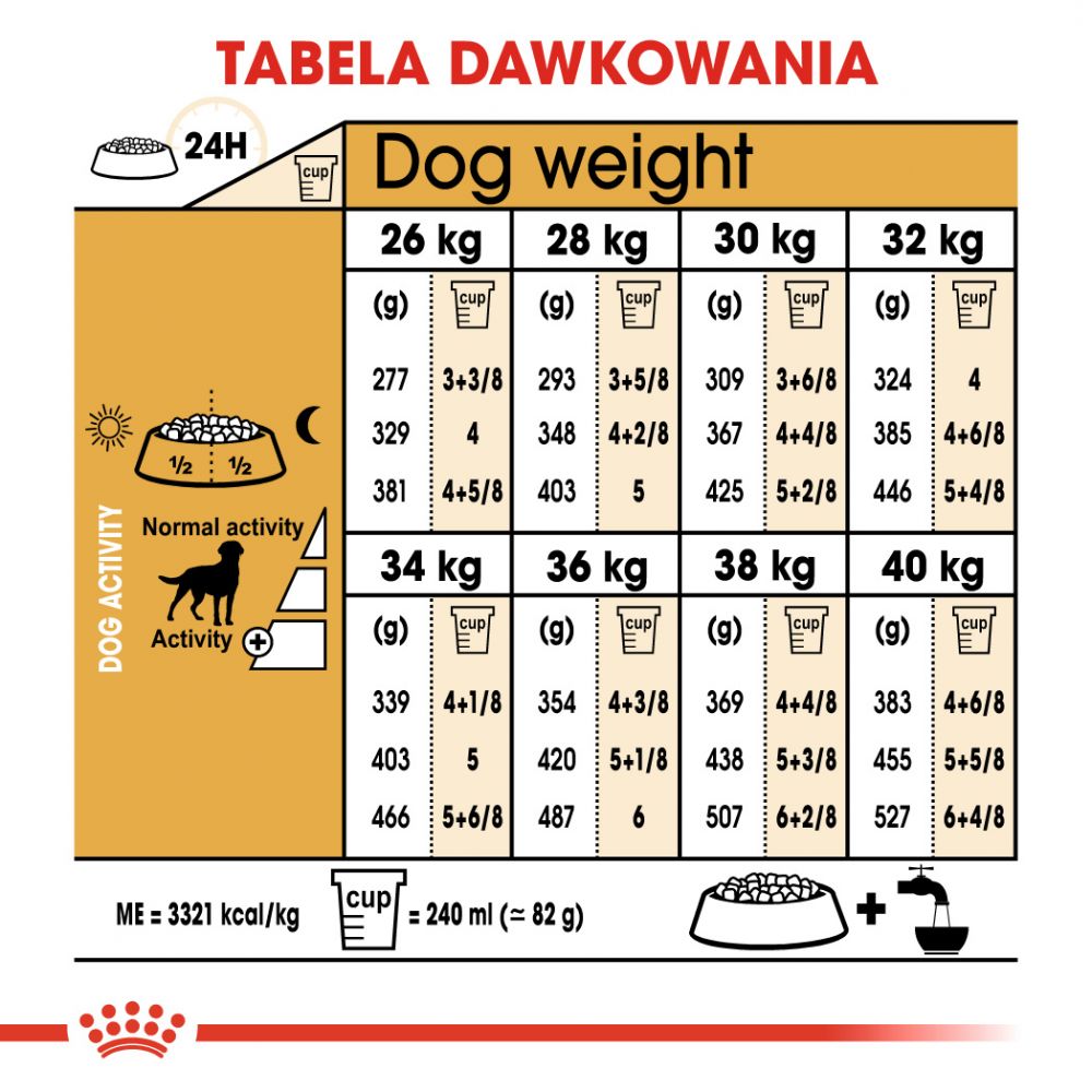 Karma ROYAL CANIN® Labrador Retriever Sterilised odpowiada specyficznym wymaganiom pokarmowym dorosłych psów rasy labrador Retriever po zabiegu sterylizacji, właśnie takim jak twój dzięki podwyższonej zawartości białka (30%) oraz zmniejszeniu podaży tłuszczu (11%). Zawiera również L-karnitynę, aminokwas, który odgrywa kluczową rolę w wykorzystywaniu rezerw tłuszczowych do produkcji energii przez komórki.