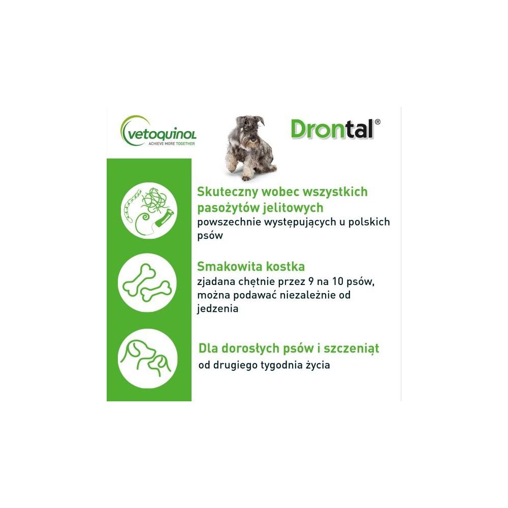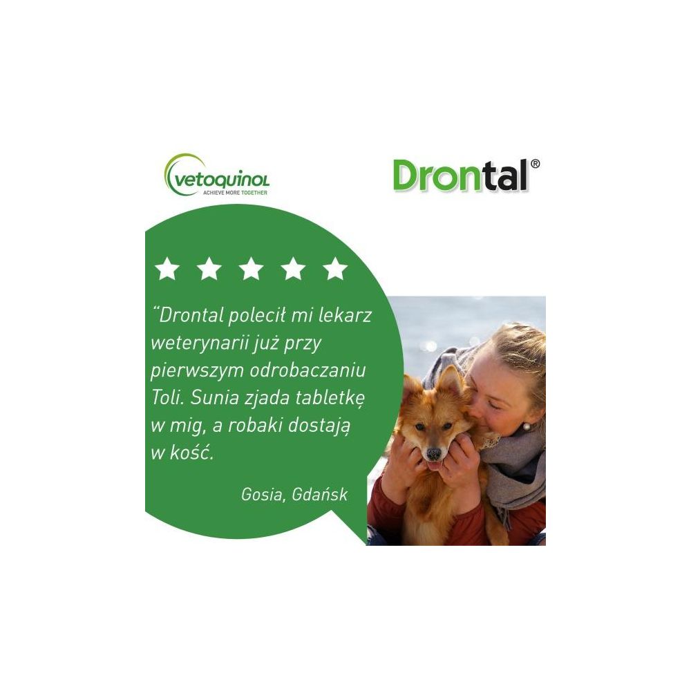 Twój pies niechętnie przyjmuje preparaty na odrobaczanie? Wiemy jak temu zaradzić! W Vetoquinol wierzymy, że skuteczność i dobry smak powinny iść w parze. Dlatego jest lek Drontal Dog Flavour – jedyne w Polsce tabletki odrobaczające w kształcie pysznych kosteczek o mięsnym aromacie. Twój pies schrupie Drontal - solo, bądź wymieszany z jedzeniem. To zdecydowanie najbardziej smakowity wybór na robaki! Ponieważ, jak pokazują badania, aż 9 na 10 psów zjada Drontal Dog Flavour chętnie.