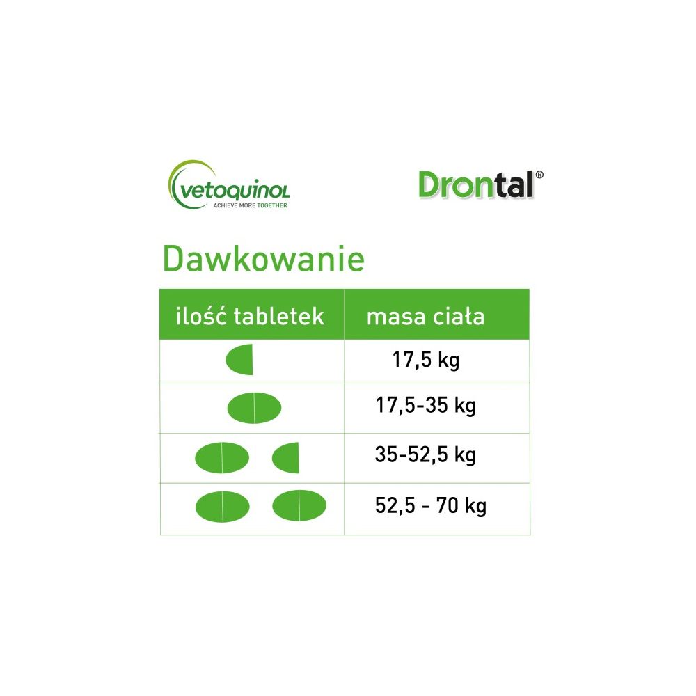 Przykładowe dawkowanie: 17,5 kg masy ciała- ½ tabletki 17,5 – 35 kg m.c.- 1 tabletka 35 – 52,5 kg m.c.- 1 ½ tabletki 52,5 – 70 kg m.c.- 2 tabletki