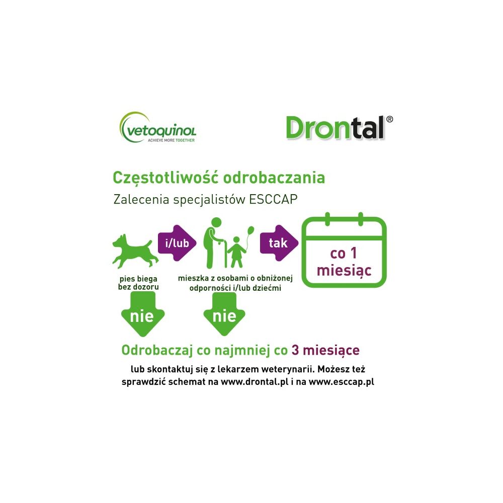 Zwalczanie nicieni i tasiemców - produkt podaje się jednorazowo. W przypadku odrobaczania szczeniąt po pierwszym podaniu produktu może nie dojść do całkowitej eliminacji pasożytów, dlatego należy ponownie podać produkt w 6, a potem 12 tygodniu życia. W celu eliminacji oraz ograniczenia ryzyka ponownej inwazji nicieni i tasiemców zalecane jest rutynowe stosowanie co 3 miesiące. Przy dłuższym stosowaniu produktu wskazana jest konsultacja z lekarzem weterynarii, który może zalecić zmianę produktu w celu zmniejszenia ryzyka wystąpienia oporności pasożytów. Zwalczanie Giardia spp. - leczenie należy kontynuować przez 3 kolejne dni.